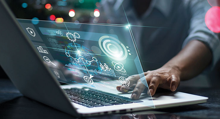 Data scientists. Male programmer using laptop analyzing and developing in various information on futuristic virtual interface screen. Algorithm. marketing and deep learning of artificial intelligence